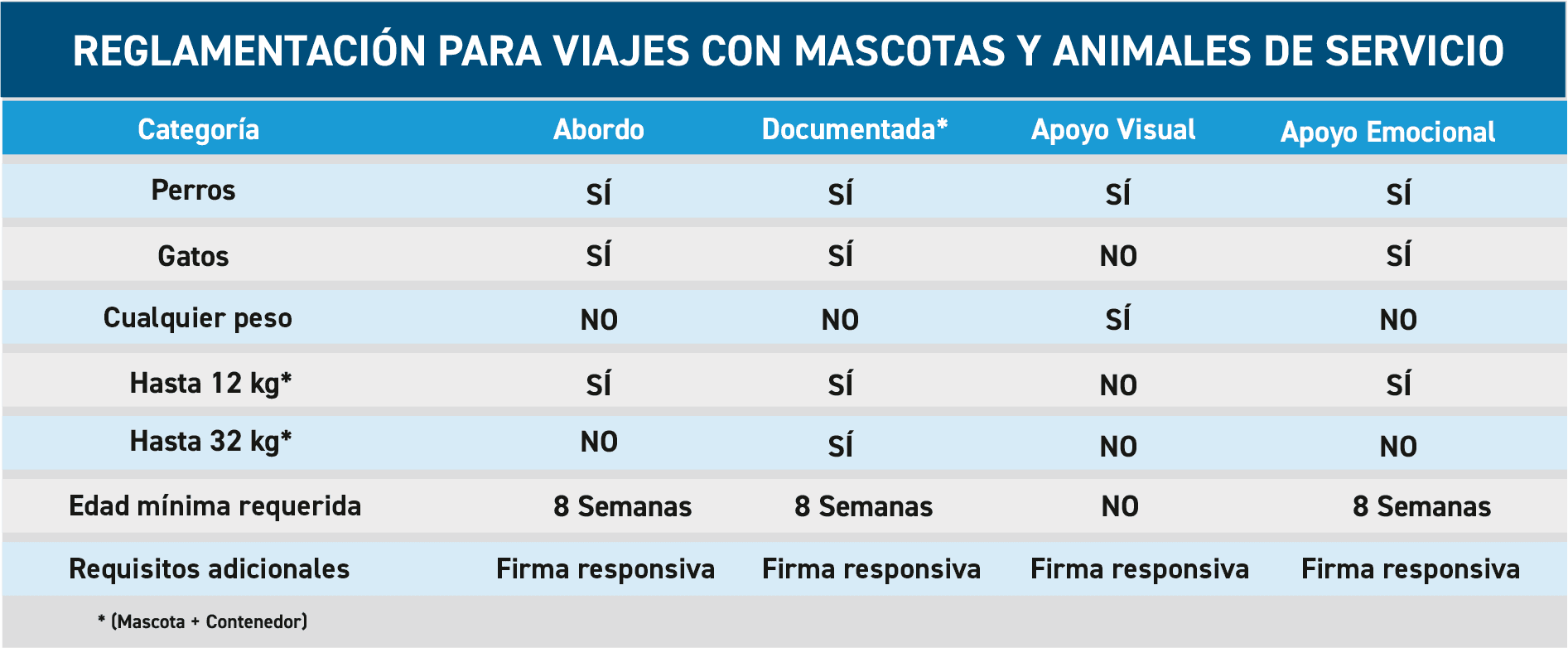 Se podrán llevar consigo mascotas documentadas en el compartimiento de equipaje de la unidades de un piso sin cargo adicional si se cumplen con los siguientes requisitos: